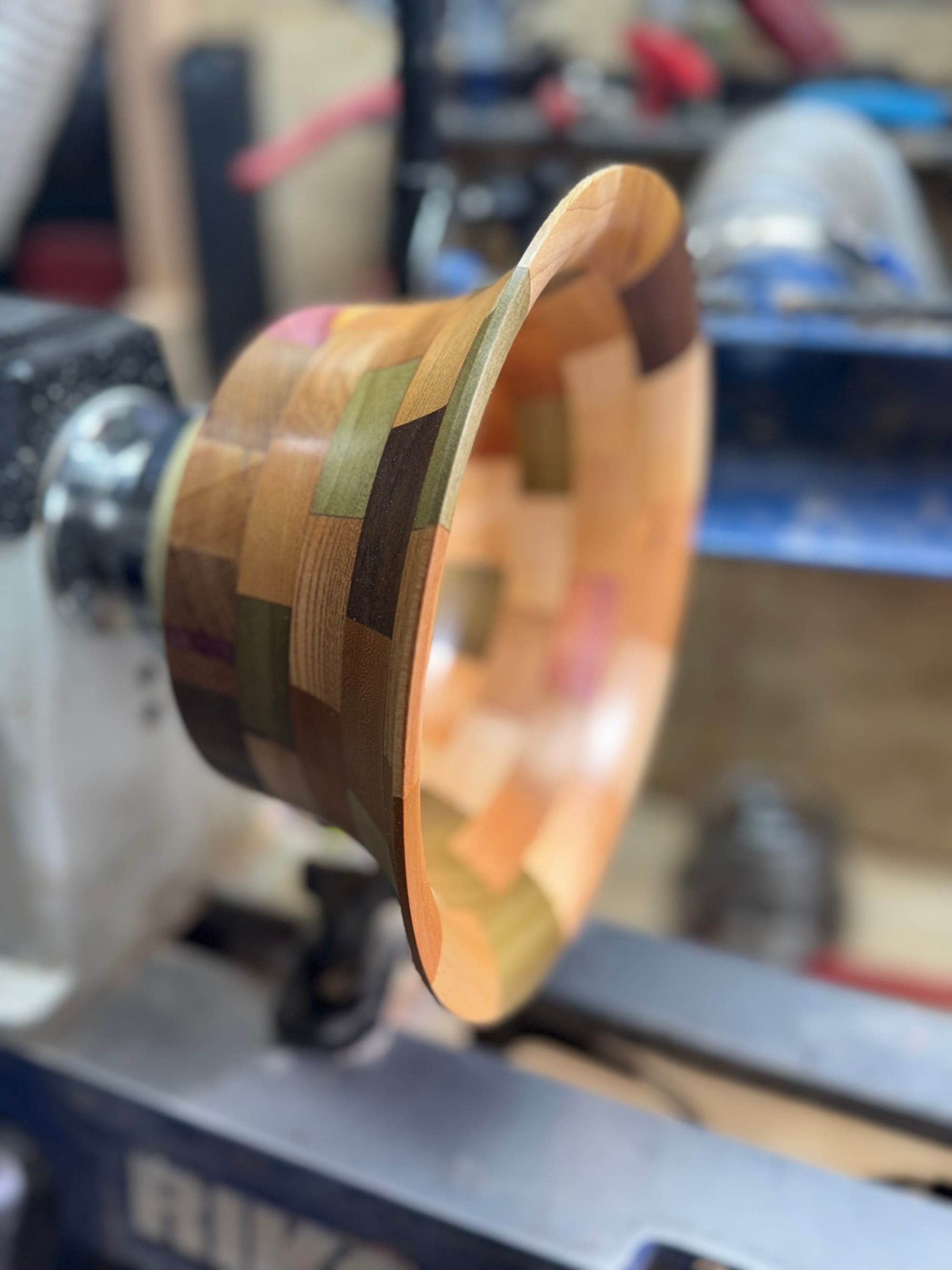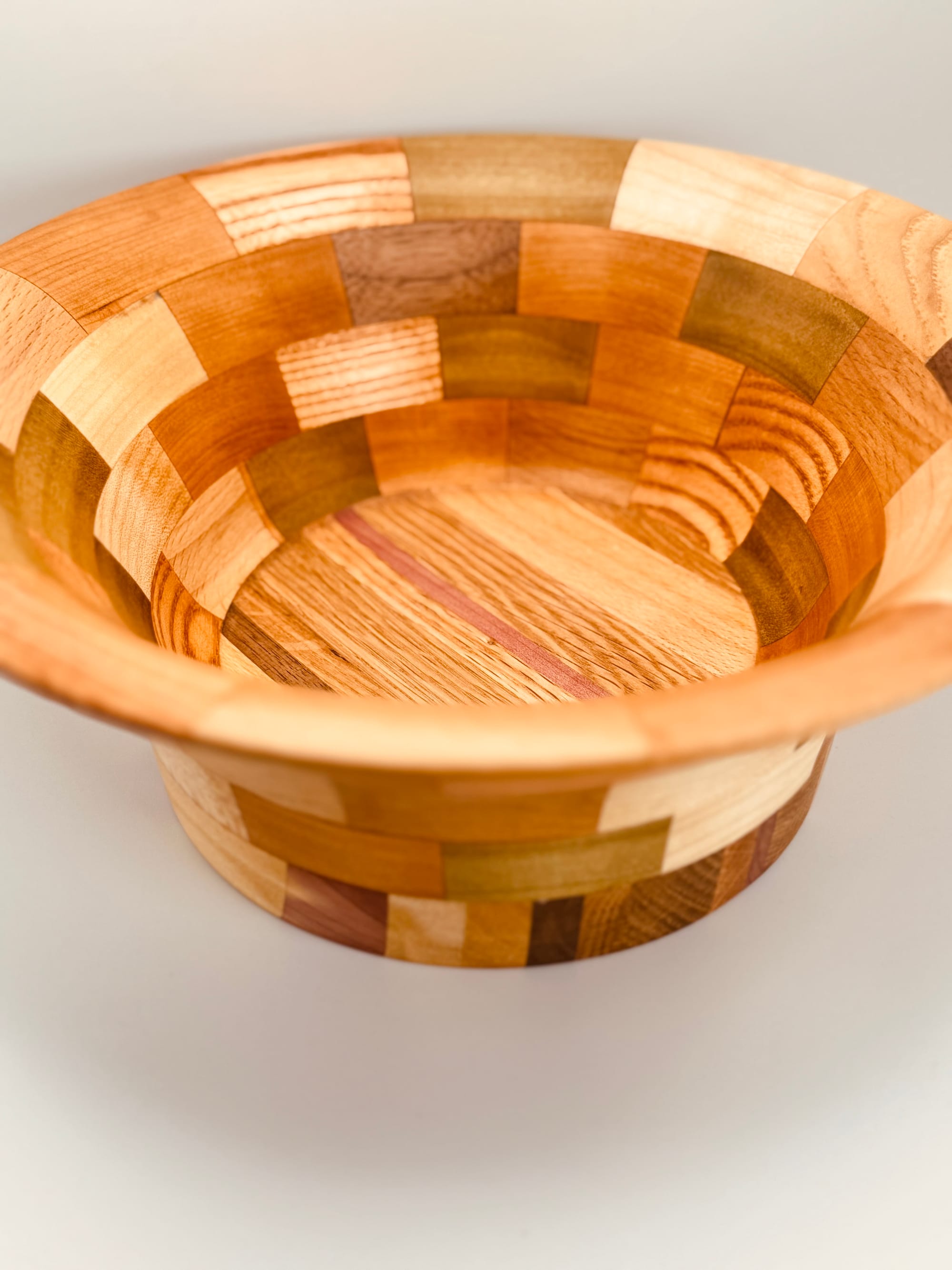 This bowl is a bit different from my usual turnings, and it was a really rewarding project to complete. It's made using a segmented turning technique, where I join together many small pieces of different woods to create a larger blank. Then, I turn that blank on the lathe to reveal the final shape.