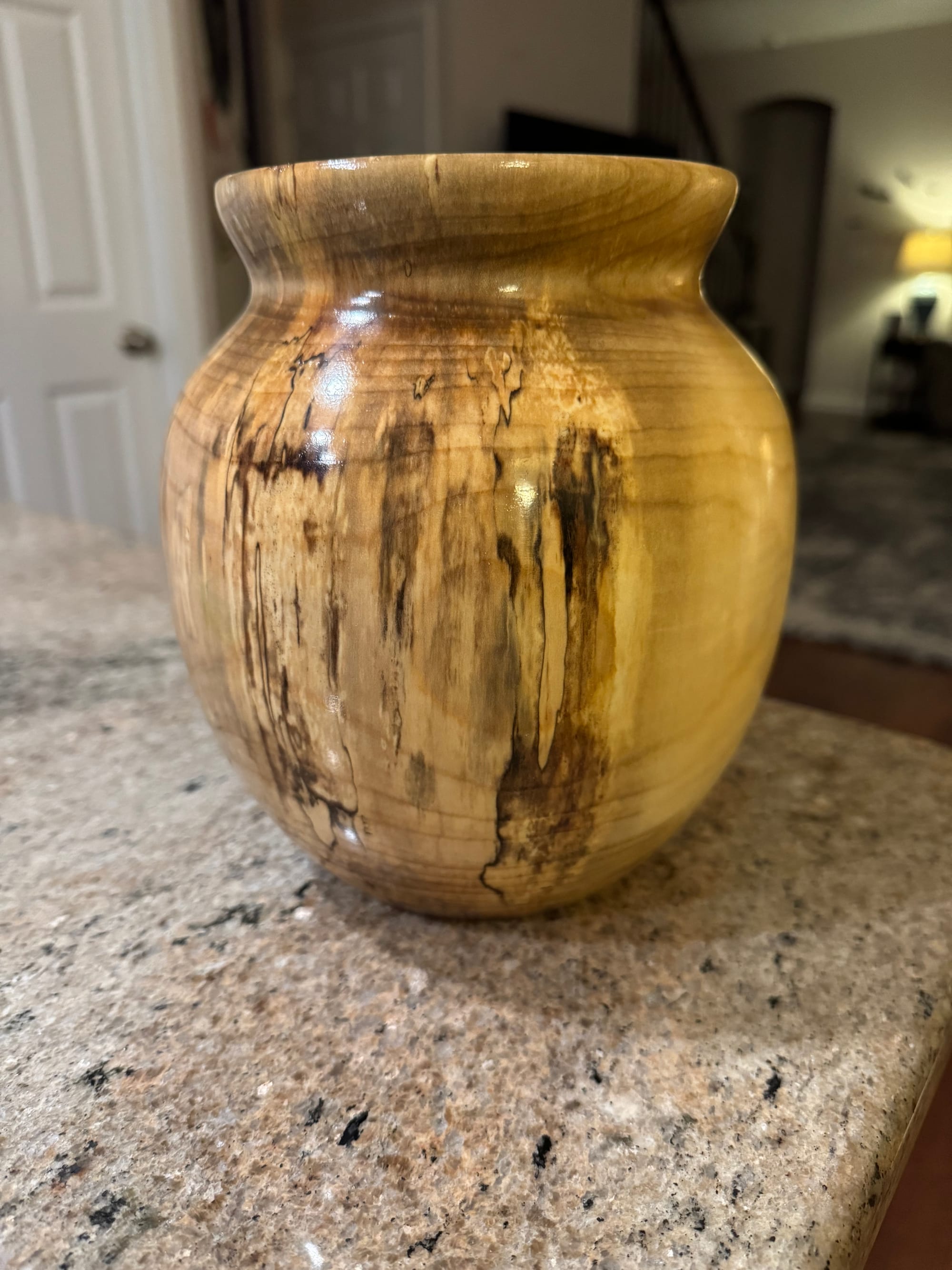This spalted wood vase is a captivating piece showcasing the unique beauty of wood turned on a lathe. It highlights the striking abstract patterns created by nature's own artistry.