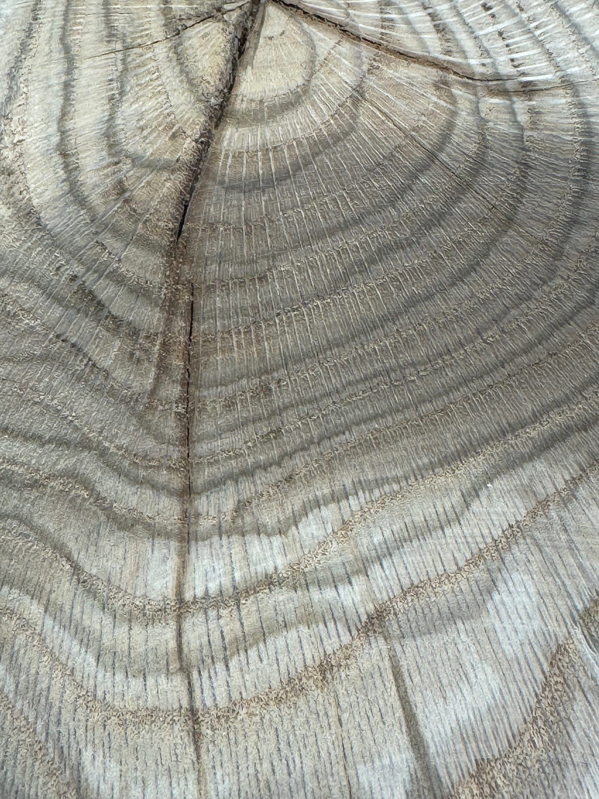 One of the most striking features of this piece is the sapwood/heartwood contrast. The bright, creamy white of the sapwood sits in dramatic opposition to the muted, silvery-grey tones of the heartwood.